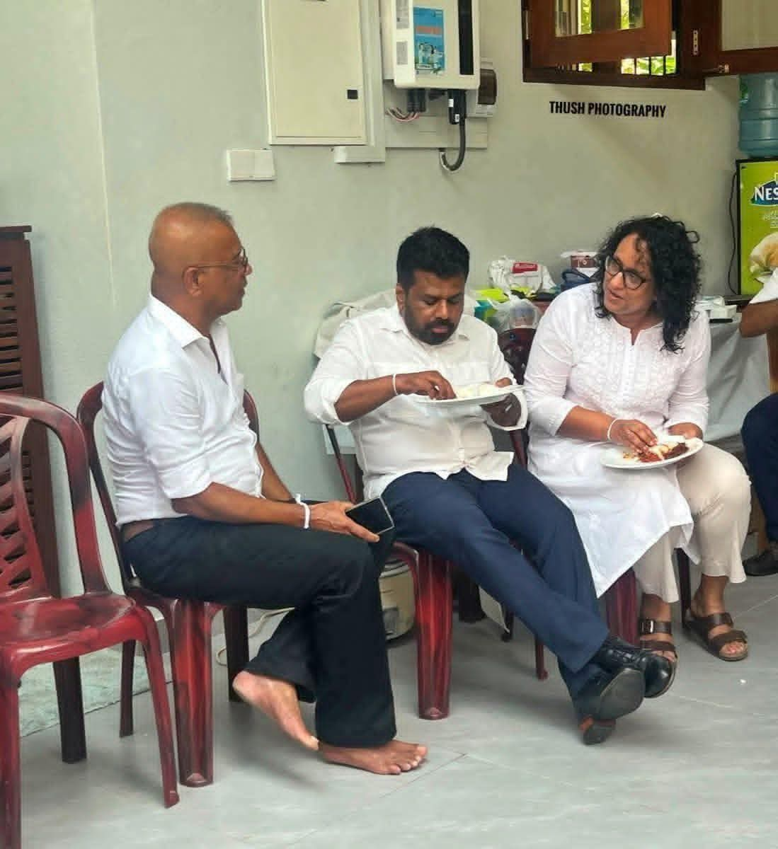 The photographs were clearly intended to project an image of simplicity. There was the President, the Prime Minister, and cabinet ministers — seated on ordinary plastic chairs, eating from simple plates like ordinary citizens at an almsgiving ceremony hosted by a senior government minister at his residence in Kaduwela.