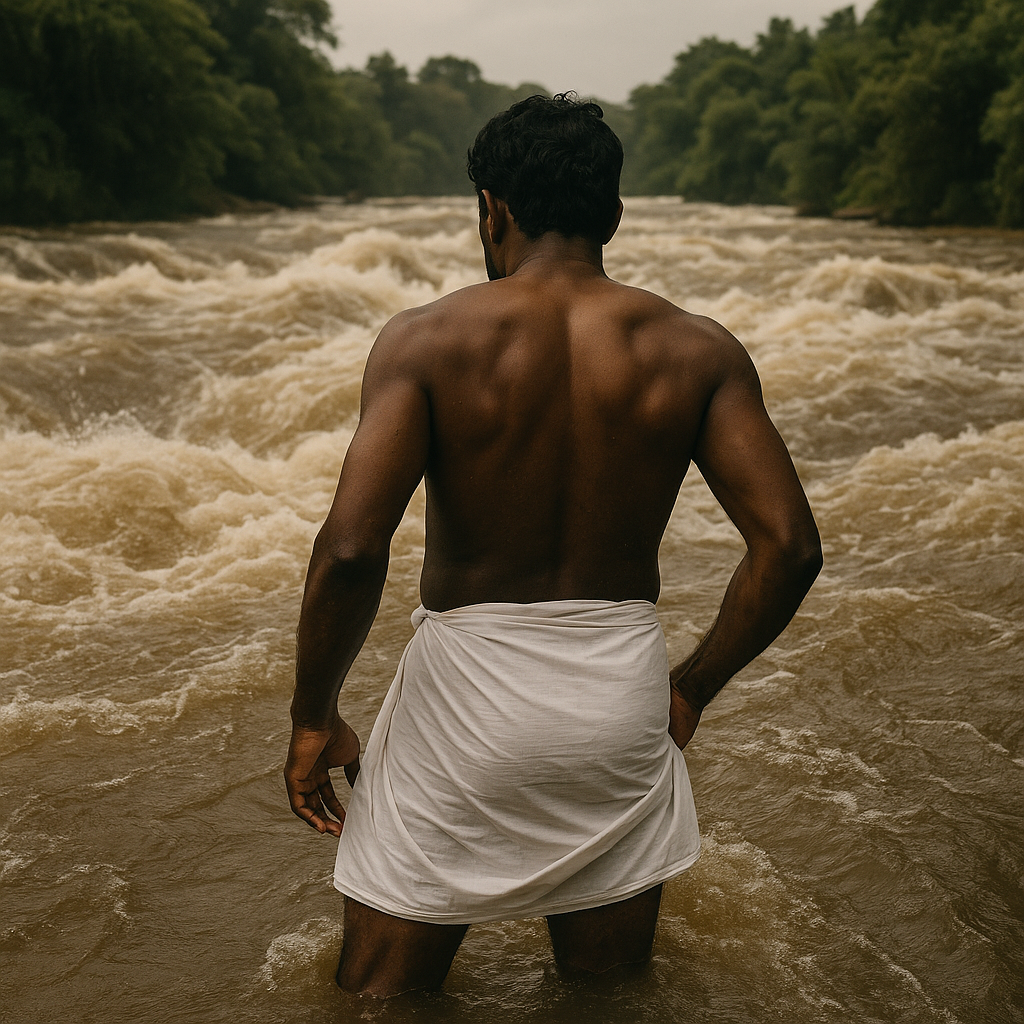 Manikkam’s eyes were fixated on the treacherous maelstroms appearing here and there on the river’s surface, only to disappear again. He shook himself from his reverie, securely tied the basket of betel leaves onto his head and waded into the river.