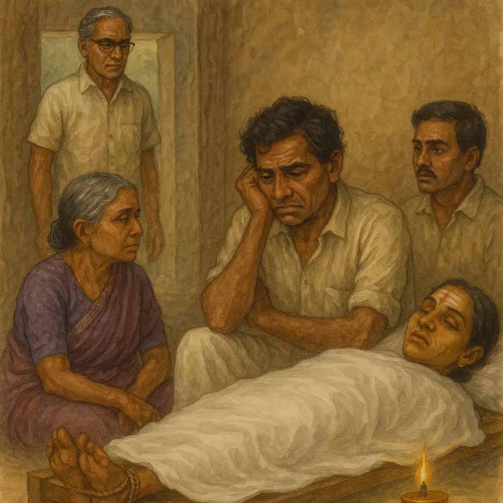 A clean white sheet is draped over her. Sandalwood paste in her eyes! Dried thirunīṟu on her forehead; vermillion on top of it; they have taken care to do all the ritual decorations worthy of a high-status corpse without leaving anything amiss.